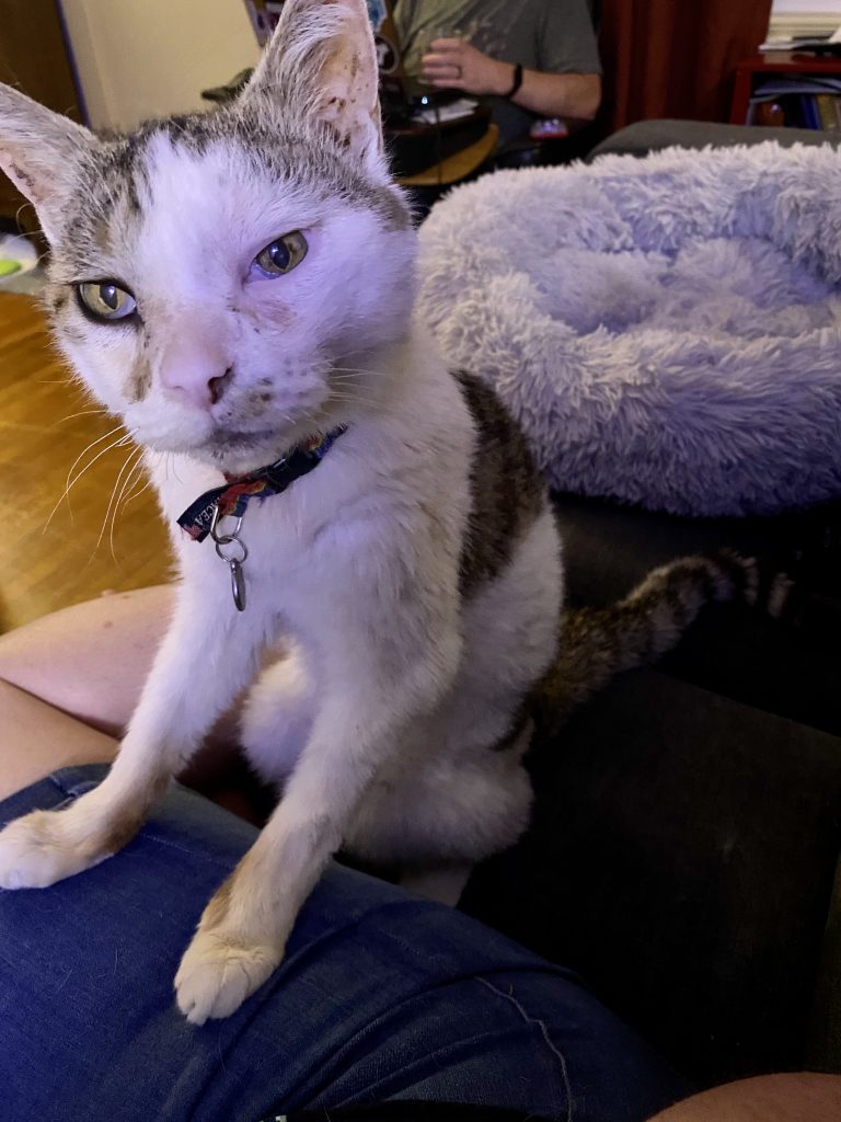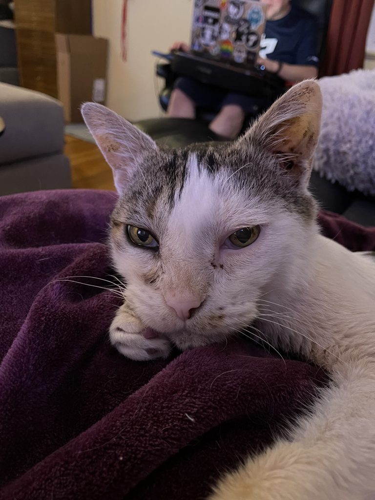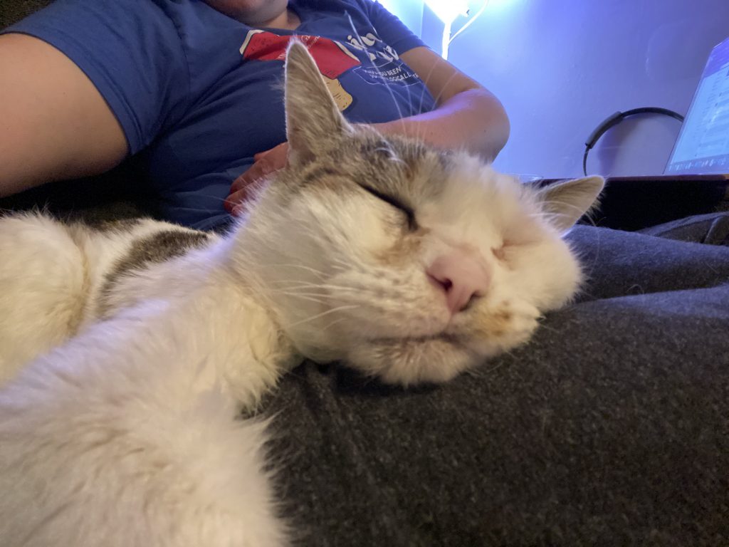 And he’d usually look up at me or stir slightly, but he always went right back to sleep moments later. Until I’d need to shift again. Over and over again. All night. Every night. I don’t remember when he started doing it, but it was sometime in 2020. Once in a while he’d still have a lap desk night, but I don’t think he ever went a night without at least a little Momma hip time.